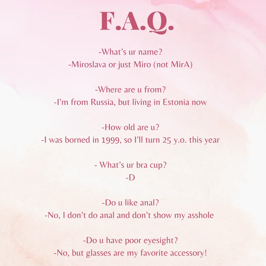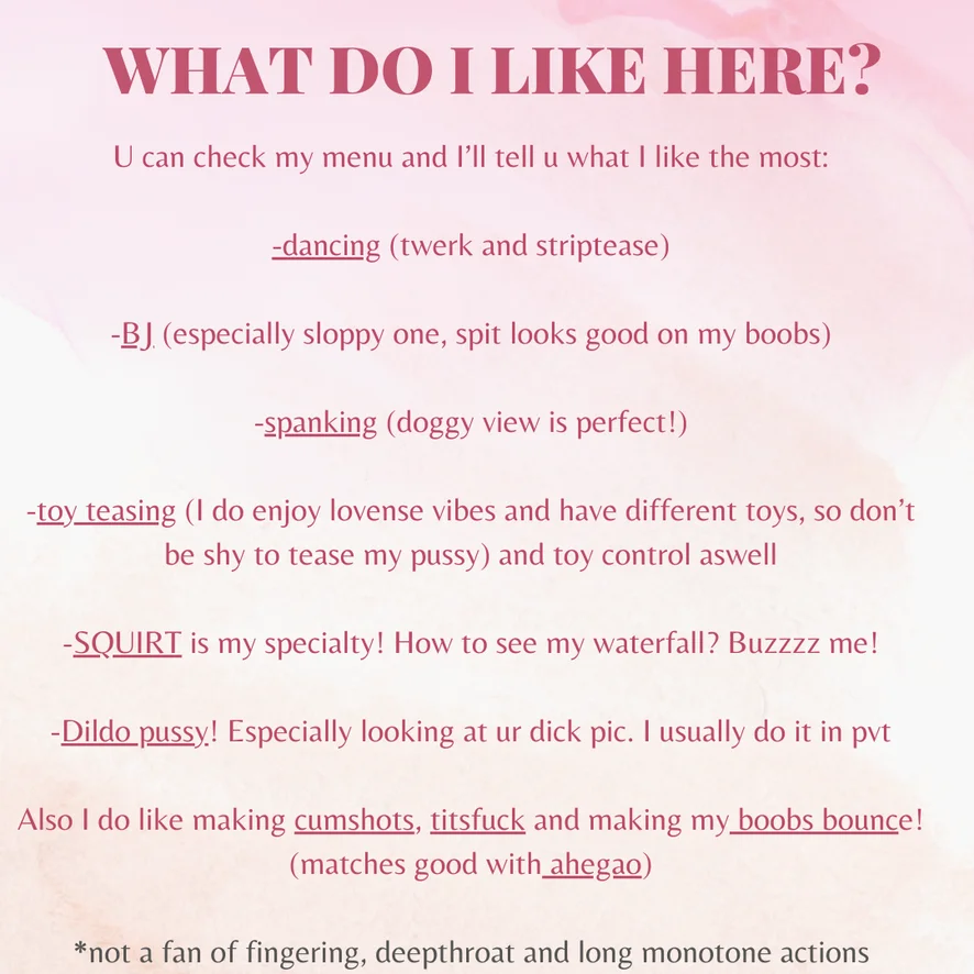 Tepelklemmen, Cumshot, Tietneuken, Pijpen, Op z'n Hondjes, Seksspeeltjes, Twerken, Striptease, Spanking, Squirten, Topless, Ahegao, Pik beoordeling, Olie show, Dirty Talk, Cowgirl, Erotische dans, Hakken, Voetfetisj, Rollenspel, Masturberen, Orgasme, Vernedering, Dildo of vibrator, Handjob, Vingeren